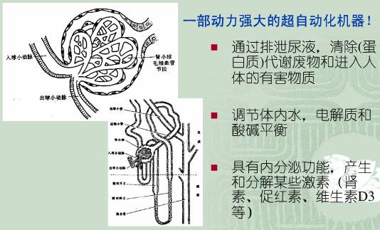(3)内分泌功能。① 分泌肾素、前列腺素、激肽。通过肾素—血管紧张素—醛固酮系统,和激肽—缓激肽—前列腺素系统来调节血压。② 促红细胞生成素,刺激骨髓造血。③ 活性VitD3 。调节钙磷代谢。④ 许多内分泌激素降解场所——如胰岛素、胃肠激素等。当肾功能不全时,这些激素T1/2明显延长,从而引起代谢紊乱。⑤ 肾外激素的靶器官。如甲状旁腺素、降钙素等。可影响及调节肾脏功能。