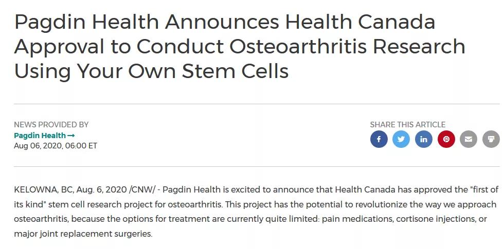 ÔÚ¹ú¼ÊÉÏ£¬¸Éϸ°ûÖÎÁƹǹؽÚÑ×µÄÁÙ´²Ó¦ÓÃͬÑù±»¿´ºÃ¡£½üÈÕ£¬¼ÓÄôóÎÀÉú²¿Åú×¼ÁËÕë¶Ô¹Ç¹Ø½ÚÑ׵ĸÉϸ°ûÑо¿ÏîÄ¿¡£¸ÃÏîÄ¿Õë¶ÔÄêÁäÔÚ19ËêÖÁ79ËêµÄ¹Ç¹Ø½ÚÑ×»¼Õߣ¬¸Éϸ°ûÀ´Ô´Îª×ÔÌåÖ¬·¾»ò¹ÇË裬´ËÍ⻹¼ÓÈëÁË»¼ÕßѪҺµÄ¸»ÑªÐ¡°åѪ½¬£¨PRP£©¡£