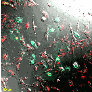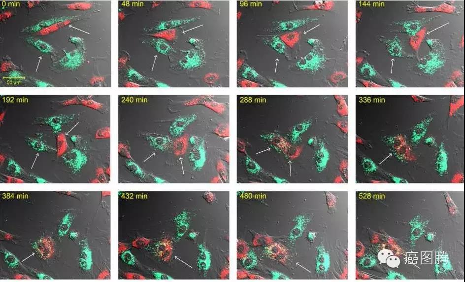 »îϸ°ûȾΪºìÉ«£¬ËÀÍöµÄÐļ¡Ï¸°ûȾΪÇàÉ«£¬¼ä³äÖʸÉϸ°û²»¶ÏÇ¨ÒÆ£¬¼ýÍ·ËùÖ¸²¿Î»¼ä³äÖʸÉϸ°ûÖð½¥ÓëËÀÍöϸ°ûÈںϳÉΪ˫ºË£¬400·ÖÖÓʱËÀÍöµÄÐļ¡Ï¸°û¿ªÊ¼Ææ¼£°ãµØ¸´»î¡£