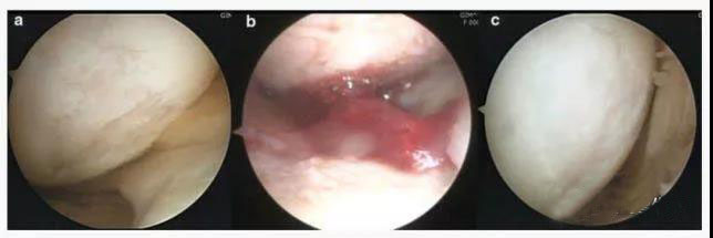 ͼ½â£ºÍ¼aΪÖÎÁÆÇ°¹Ø½Ú¾µ¼ì²é½á¹û£¬¿ÉÒÔ¿´³öÈí¹Ç´æÔÚȱËð£»Í¼bΪ¸Éϸ°ûÁÆ·¨ÁªºÏ¸»ÑªÐ¡°åѪ½¬×¢É䣬ͼcΪÐÞ¸´ºó½á¹û£¬°×Çø°ëÔ°åËðÉËÐÞ¸´Á¼ºÃ¡£