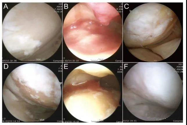 ͼ½â£ºÍ¼ÖÐA-CΪ51ËêÄÐÐÔÏ¥¹Ø½Ú¾µ£¬D-FΪ54ËêÅ®ÐÔÏ¥¹Ø½Ú¾µ¡£A/DΪÖÎÁÆÇ°£¬°×ɫʾÒâÈí¹Ç£¬Ç³»ÆÉ«Ê¾ÒâÂ㶵Ĺǡ£B/EΪ¼ä³äÖʸÉϸ°û×¢Éä¡£C/FΪÖÎÁƺóµÄ¹Ø½Ú¾µ¼ì²é¡£