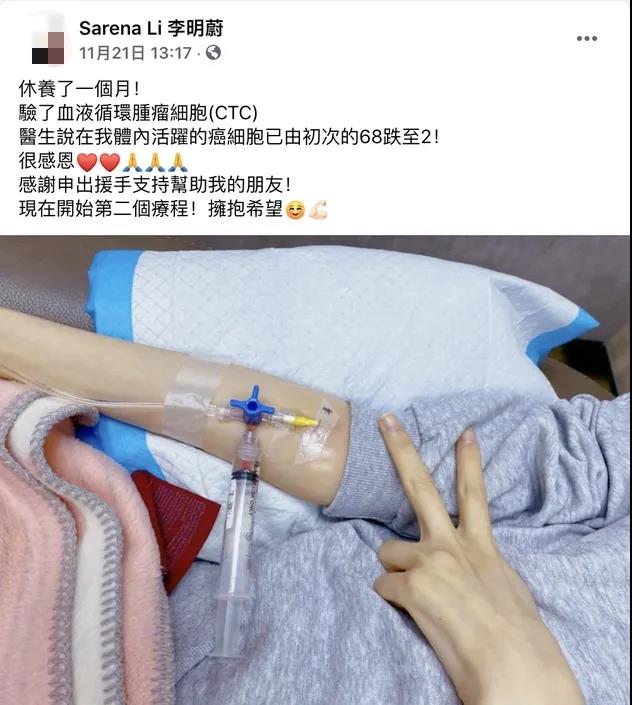ÏÖÄê31ËêµÄÏã¸Ûij¸èÊÖ×Ô´Ó±»Õï¶Ï»¼ÉϱÇÑÊÏÙÑùÄÒÐÔ°©Ö®ºó¾ÍÒ»Ö±»ý¼«¿¹°©£¬Àú¾9ÄêµÄʱ¼ä£¬²¡ÇéÒ»Ö±·´·´¸´¸´£¬Ã»Óеõ½¸ùÖΡ£ÔÚÖÚ¶àºÃÓÑÒÔ¼°ÒÕÈËÅóÓѵİïÖúÏ£¬½üÈճɹ¦³ï¼¯µ½ÁËÉÆ¿î½øÐС°ÃâÒßϸ°û¡±ÖÎÁÆ·¨¡£ÉϸöÔ³õ¸Ã¸èÊֳɹ¦µØÍê³ÉÁ˵ÚÒ»¸öÁƳ̡£2020Äê11ÔÂ21ºÅÕâλ¸èÊÖÔÚ¸öÈËÉç½»Õ˺ÅÉÏ·¢²¼ÁËÒ»ÔòÈÃÈËÊ®·ÖÐ˷ܵÄÊÂÇ飬Ëý˵µÀ£º¡°ÐÝÑøÁËÒ»¸öÔ£¡ÑéÁËѪҺѻ·Ö×Áöϸ°û(CTC)Ò½Éú˵ÔÚÎÒÌåÄÚ»îÔ¾µÄ°©Ï¸°ûÒÑÓɳõ´ÎµÄ68µøÖÁ2£¡¡£¡±£¨°©Ï¸°û´Ó68µøÖÁ2£¬»¼°©¸èÊÖÊ×½×¶ÎÃâÒßϸ°ûÖÎÁƼûЧ£¡£©