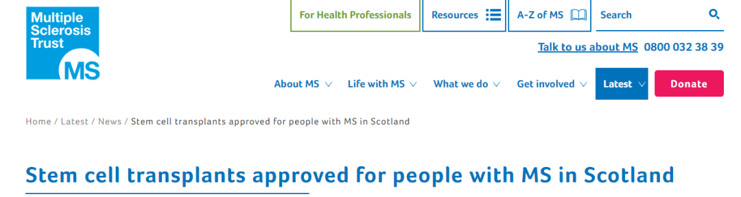 ÔÚ2019Äê10ÔÂ31ÈÕ£¬¾ÍÓÐÍâý±¨µÀ£¬ËÕ¸ñÀ¼½¡¿µ¼¼ÊõлᣨThe Scottish Health Technologies Group£¬SHTG£©Åú×¼×ÔÌåÔìѪ¸Éϸ°ûÒÆÖ²ÓÃÓÚÖÎÁƸ߶ȻîÔ¾µÄ¸´·¢»º½âÐͶ෢ÐÔÓ²»¯£¨RRMS£©£¬×÷Ϊ¶à·¢ÐÔÓ²»¯µÄÒ»ÖÖÐÂÐÍÖÎÁÆ·½Ê½¡£