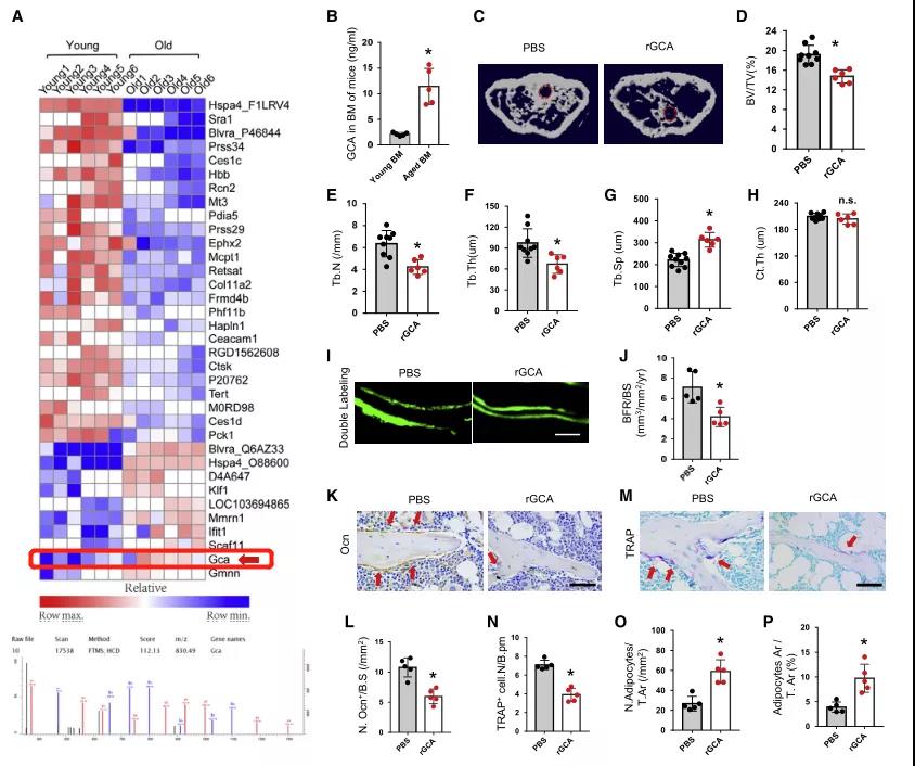 ΪÁËÈ·¶¨¹ÇËèÖÐÓ°Ïì¹ÇÁäµÄ¹Ø¼üË¥ÀÏÏà¹Ø·ÖÃÚ±íÐÍ(SASP)Òò×Ó£¬ÀûÓÃÖÊÆ×·ÖÎöÄêÇá(3ÔÂÁä)ºÍÀÏÄê(24ÔÂÁä)´óÊó¹ÇËèÉÏÇåÒº£¬Ñ°ÕÒµ½ÓÉÖÐÐÔÁ£Ï¸°ûºÍµ¥ºË¾ÞÊÉϸ°û·ÖÃÚµÄGCA£¬ÆäÔÚÀÏÄê´óÊó¹ÇËèÖеıí´ïÃ÷ÏÔ¸ßÓÚÄêÇá´óÊ󣬸ÃÏÖÏóÔÚСÊóÉíÉÏͬÑù¾ßÓУ»½ÓÏÂÀ´ÔÚСÊó¹ÇËèÄÚ×¢ÉäÈËRGCA»òPBSÀ´²âÊÔGCA¶Ô¹ÇÀÏ»¯µÄÓ°Ï죬һϵÁеļì²â½á¹û(RGCA×éСÊóÖйÇСÁºÌå»ý¡¢ÊýÁ¿ºÍºñ¶È½ÏµÍ£»ÇҳɹÇϸ°û¹ÇÐγɡ¢ÆÆ¹Çϸ°û¹ÇÎüÊÕ½µµÍºÍ¹ÇËèÖ¬·¾¶Ñ»ýÔö¼ÓµÈ)±íÃ÷¹ÇËèÖÐGCA¸ß±í´ï¿ÉÄÜͨ¹ý½µµÍ¹Çת»»ºÍ´Ù½ø¹ÇËèÖ¬·¾»ýÀÛÀ´ÆÆ»µ¹Ç¶¯Ì¬Æ½ºâ¡£
