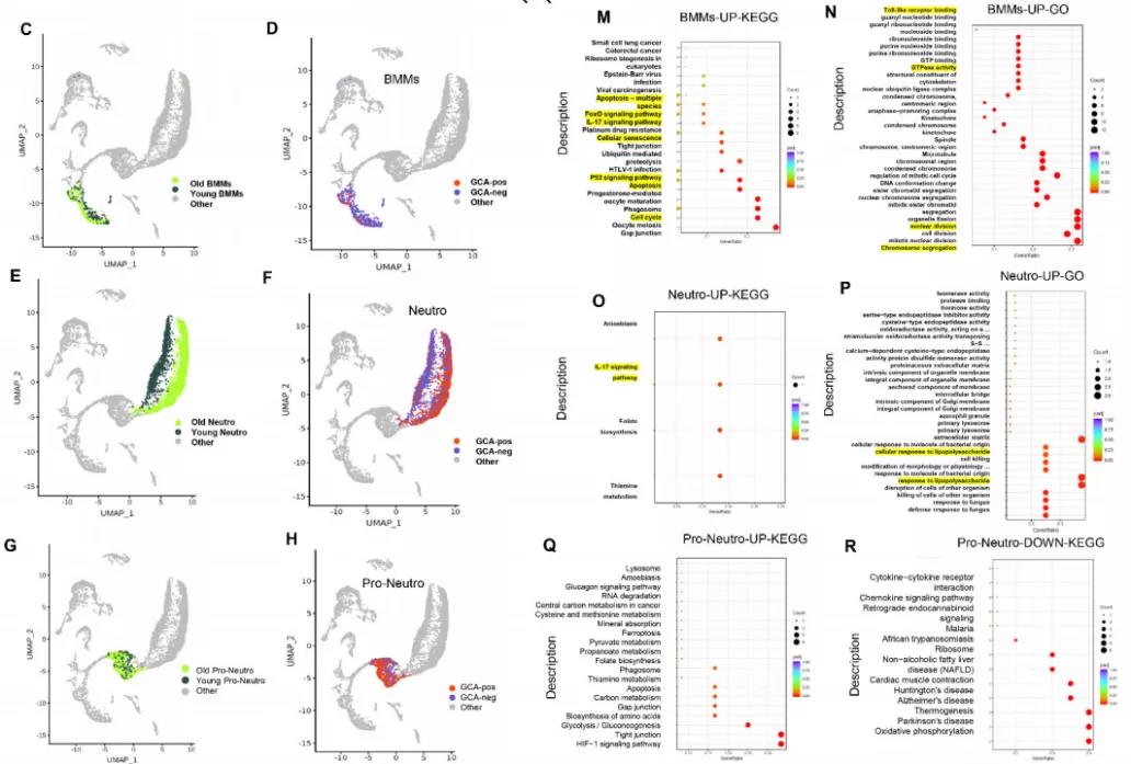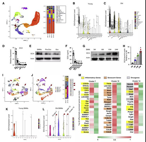ǰÆÚÑо¿·¢ÏÖË¥ÀϹÇËèÖеÄGCAˮƽ½Ï¸ß£¬µ«²»Çå³þ¾ßÌåÓÐÄÄЩϸ°û¶¼±í´ïGCA¡£Ê¹ÓÃscRNA-seqÊý¾Ý¼¯(À´Ô´(Ma et al., 2020)¹ØÓÚÄêÇáºÍÀÏÄêµÄ´óÊó¶à¸ö×éÖ¯ÖÐÓëË¥ÀÏÏà¹ØÑо¿µÄÎÄÕÂ)½øÐÐÉúÐÅÍÚ¾ò·ÖÎö£¬·¢ÏÖÄêÇá´óÊóÖÐGCAÖ÷ÒªÔÚÃâÒßϸ°û±í´ï£¬°üÀ¨ÖÐÐÔÁ£¡¢¾ÞÊÉ¡¢Á£Ï¸°û-¾ÞÊÉϸ°ûǰÌå(GMP)ºÍBϸ°û£¬ÓëÒÔǰµÄÑо¿Ò»Ö¡£ÀÏÄê´óÊóÖÐÐÔÁ£ºÍ¾ÞÊÉϸ°û(Ö÷ÒªÊÇM1Ñù¾ÞÊÉϸ°û)µÄGCA±í´ïÊÇÄêÇá´óÊóµÄ10-15±¶£¬¶øM2Ñù¾ÞÊÉ¡¢T¡¢BºÍBMSCsµÄGCA±í´ïûÓÐÏÔÖø²îÒì¡£´ËÍ⣬ÀÏÄê´óÊó¹ÇËèÖÐGCA+ÃâÒßϸ°û(°üÀ¨ÖÐÐÔÁ£¡¢µ¥ºË¾ÞÊɺÍM1Ñù¾ÞÊÉϸ°û)µÄÊýÁ¿ºÍ±ÈÀý¾ù¸ßÓÚÄêÇá´óÊó¡£¶ÔGCA+ÃâÒßϸ°ûȺ½øÐй¦Äܸ»¼¯·ÖÎö£¬GO·ÖÎöÏÔʾGCA+(°üÀ¨¾ÞÊɺÍÖÐÐÔÁ£Ï¸°û)ÖÐÉϵ÷µÄ»ùÒò¸»¼¯ÔÚÖ¬¶àÌǵķ´Ó¦¡¢ºË·ÖÁÑ¡¢È¾É«Ìå·ÖÀëºÍGTPase»îÐÔÖУ»KEGG·ÖÎö±íÃ÷GCA+ÃâÒßϸ°ûÖÐÉϵ÷µÄ»ùÒò¸»¼¯ÔÚϸ°ûÖÜÆÚ¡¢µòÍö¡¢p53ÐźÅͨ·¡¢Ï¸°ûË¥ÀÏ¡¢IL-17ÐźÅͨ·ºÍFoxOÐźÅͨ·ÖУ¬ÕâЩÐźÅͨ·ÔÚÑ×Ö¢¡¢Ë¥ÀϺÍÖ×Áö·¢ÉúÖÐÆð¹Ø¼ü×÷Óá£