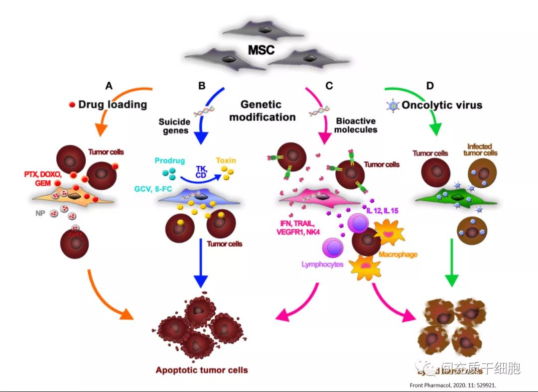 ÓÉÓÚMSC¾ßÓеÍÃâÒßÔÐÔºÍÇ÷»¯µ½Ö×Áö»ùÖʵÄÌØÐÔ£¬ÊÇÒ»¸ö·Ç³£ÀíÏëµÄЯ´ø¿¹Ö×ÁöÉúÎï»îÐÔÒ©ÎïµÄÔØÌå¡£2002ÄêÊ״α»ÓÃÀ´´«µÝ¸ÉÈÅËØ-¦Â£¬ÓÃÓÚÖÎÁƺÚÉ«ËØÁö£¬¼õÉÙÖ×ÁöÉú³¤£¬ÑÓ³¤Ð¡ÊóÄ£Ð͵ÄÉú´æÆÚ¡£´ÓÄÇʱÆð£¬Ñо¿ÈËÔ±ÏàÐø»ùÒò¸ÄÔìMSCÓÃÓÚ¸÷ÖÖÖ×ÁöµÄÖÎÁÆ£¬±ÈÈçתȾIFN-¦ÂÖÎÁÆÒÈÏÙ°©ºÍºÚÉ«ËØÁö¡¢×ªÈ¾IL-12ÖÎÁƺÚÉ«ËØÁöºÍ¸Î°©¼°½ºÖÊÁö¡¢×ªÈ¾IFN-¦ÁÖÎÁƺÚÉ«ËØÁö¡¢×ªÈ¾IFN-¦ÃÖÎÁư×Ѫ²¡¡¢IL-12ÖÎÁƺÚÉ«ËØÁö¡¢·Î°©ºÍ¸Î°©¡¢IL-24ÖÎÁƷΰ©¡¢×ªÈ¾NK4ÖÎÁƷΰ©¡¢×ªÈ¾TRAILÖÎÁÆÈéÏÙ°©ºÍ½ºÖÊÁö¼°·Î°©¡¢×ªÈ¾ÈܽâÁöϸ°ûµÄÏÙ²¡¶¾ÖÎÁÆÂѳ²°©¡£