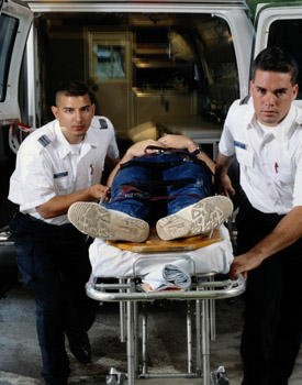 Step4 以右手握空拳,左手叠合其上,用身体的力量从右到左滚压患者胸腔;压、滚时提醒患者吸气,手放开时吐气。持续这样做,直到患者两肩会动,脸色转好。