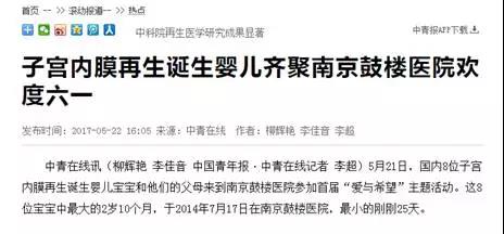据首个“再生医学宝宝”的母亲胡女士介绍,她因子宫粘连到鼓楼医院就医,中国科学院遗传与发育生物学研究所戴建武团队与南京鼓楼医院胡娅莉院长的生殖医学中心团队合作,利用“子宫内膜再生”,对胡女士的子宫内膜进行了为期8个月的修复,使之成功怀孕。2014年7月,胡女士顺利诞下国内第一例“再生医学宝宝”。如今女儿苗苗(化名)已经3岁,聪明活泼,深受家人宠爱。