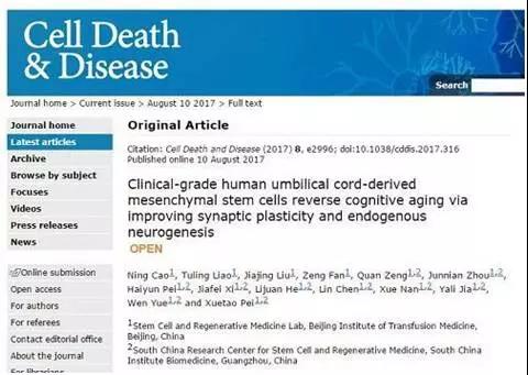 10 Cell Death & Disease:脐带间充质干细胞可抑制认知老化,有望治疗老年痴呆症