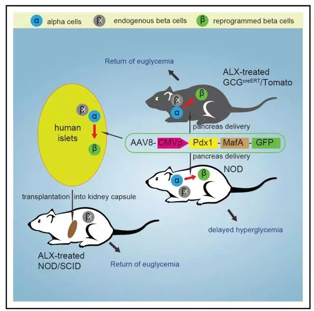 治疗1型糖尿病的成功策略需要恢复被免疫系统破坏的胰腺β细胞的功能,并克服胰岛素产生细胞的进一步破坏。研究人员注入了携带伴随Pdx1和MafA表达的腺病毒,通过胰管将α细胞重编程为功能性β细胞,并在β细胞 - 毒素诱导的糖尿病小鼠和自身免疫性非肥胖糖尿病(NOD)小鼠中恢复了他们的血糖水平。在重建自身免疫性糖尿病之前,毒素诱导的糖尿病小鼠和新胰岛素+细胞中的血糖正常持续存在于自身免疫NOD小鼠中4个月。该基因治疗策略还诱导毒素处理的人类胰岛中的α至β细胞转化,其在移植后恢复NOD / SCID小鼠中的血糖水平。因此,这种策略可能代表了一种新的治疗方法,可用于补充免疫抑制,以增强内源性胰岛素的产生。此研究为进一步研究人类1型糖尿病提供了一个潜在的基础。