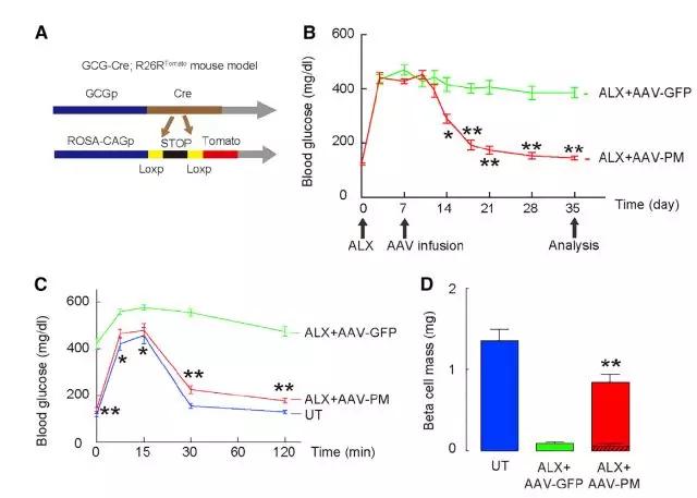 图2 AAV-PM的导管内输注矫正ALG诱导的GCG-Cre中的高血糖症