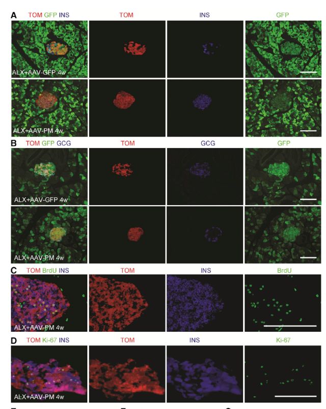 这个问题的一个可能的解决方案是将其他细胞类型重新编程成功能性的β样细胞,其可以产生胰岛素但是不同于β细胞,因此不被免疫系统识别或攻击。为了探索这种方法的可行性,匹兹堡大学医学院的Gittes设计了一种AAV载体,用于递送称为Pdx1和MafA的小鼠胰腺蛋白质,它们支持β细胞的成熟,增殖和功能。目标是从胰腺α细胞产生功能性β样细胞,这可能是β细胞替代的理想来源。例如,α细胞丰富,类似于β细胞,处于正确的位置,所有这些都可以促进重编程。