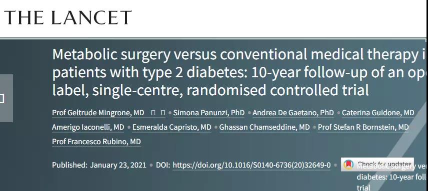 1月24日,《柳叶刀》上的新研究发现[1],代谢外科手术基本可以“治愈”II型糖尿病。这是一项开放的、单中心、随机对照临床试验,并进行了长达10年的随访研究,由英国研究团队开展。他们发现,超过三分之一接受代谢手术(胃旁路术和胆胰转流术)的患者在术后血糖维持在健康水平,在10年的随访期内,这些患者不需要药物来控制血糖水平。