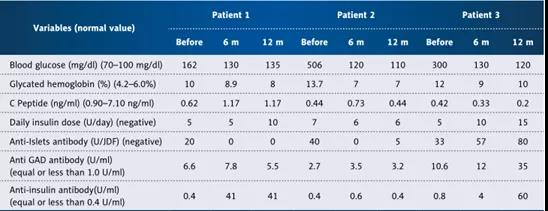 根据2013年Mesples等人的临床实验结果[4]:在两名接受自体骨髓干细胞移植治疗的1型糖尿病患者中,12个月的随访显示,ICA、GAD和抗胰岛素抗体水平均为阴性,c肽水平增加,血糖和HBA1c水平下降。(见下图,Patient1与Patient2接受干细胞移植,Patient3接受常规治疗作为对照)