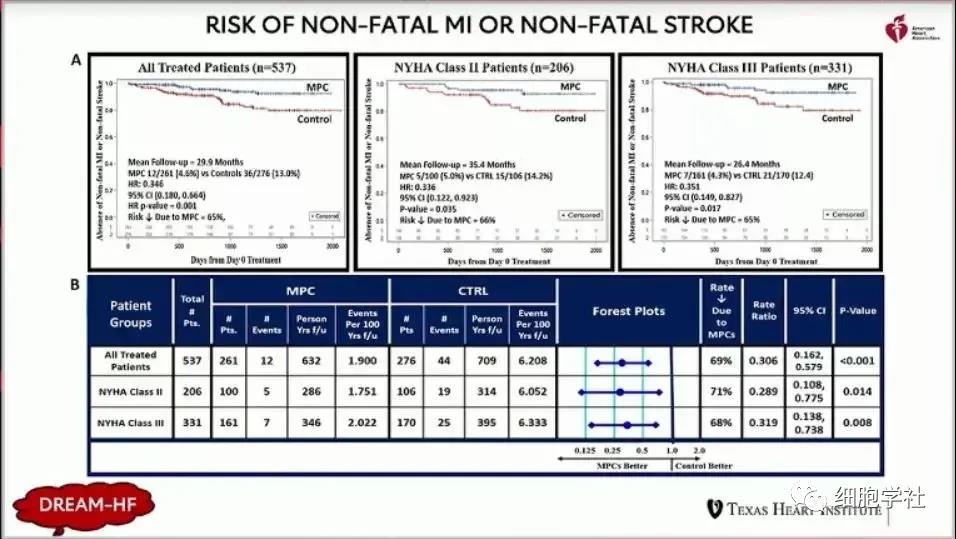 所有参与临床试验的患者在术后第二天出院。接下来,研究人员对这些参与者进行了平均29.9个月的随访。其试验设计主要终点事件是,经干细胞治疗后发生非致死性心力衰竭主要不良事件(包括心血管死亡、非致死性心肌梗死和非致死性卒中)的概率。同时也追踪了患者心脏病发作、中风或死亡情况,并测量患者体内炎症水平指标(即C-反应蛋白水平)。