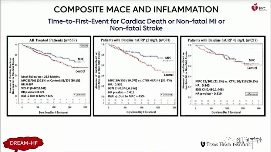 在平均随访29.9个月期间,接受单剂量Rexlemestrocel-L给药后,患者(n=537)的3点MACE降低了33%,其中合并有糖尿病/心肌缺血患者的临床获益最大。