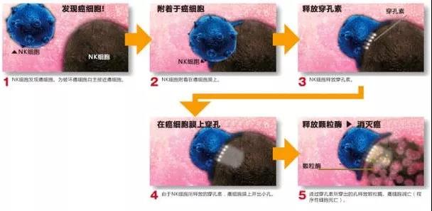 NK细胞存在于人的血液当中,它就像是一直在体内执勤的巡警,随着血液到处跑,在巡逻时,一旦发现体内出现异常细胞,马上稳、准、狠第一时间处理掉。他们在T细胞部署之前攻击并在靶细胞膜上释放含有穿孔素和颗粒酶的细胞毒性颗粒,引发癌细胞自我毁灭。它们还可以消除体内循环的癌症干细胞,有助于预防转移。