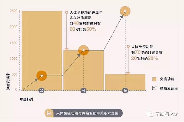 尽管他们可以迅速进行防御并直接攻击肿瘤细胞,但NK细胞只是免疫系统的一小部分,仅占白细胞的10%。并且研究发现,人类到了25岁以后,免疫力下降,NK细胞数量变得更少。特别是在40~50岁后,NK细胞的数量及功能显著下降,不能非常有效地发挥抗癌作用,癌症发病率便随之增加。