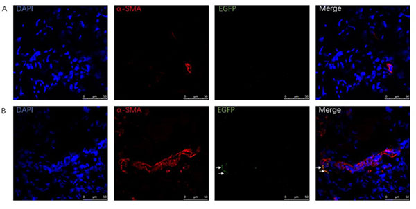 注射间充质干细胞28天后两组的免疫荧光结果。间充质干细胞治疗组未见EGFP+细胞(A),而诱导后内皮细胞治疗组中大血管上可见明显绿色荧光(B)