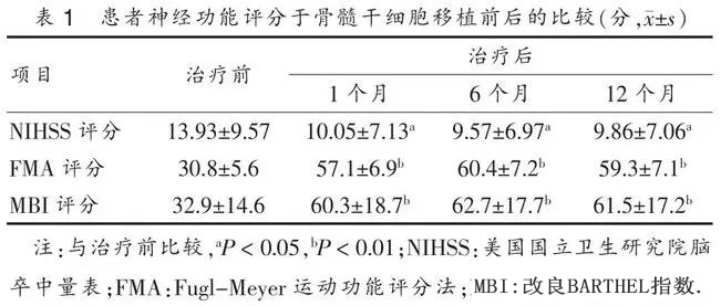[结果]: 与应用前比较, 患者应用后 1 、6 、12 个月NIHSS评分显著降低、 FMA 评分和 MBI 显著升高, 差异均有统计学意义( P < 0.05 或 P <0.01 )。